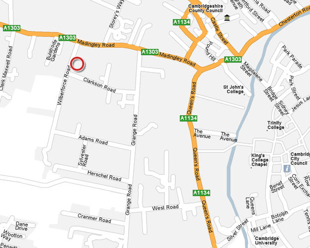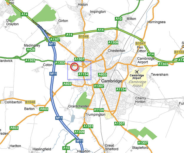 The following map shows the location of the centre within the Cambridge area. The area in the blue box is shown in more detail below.