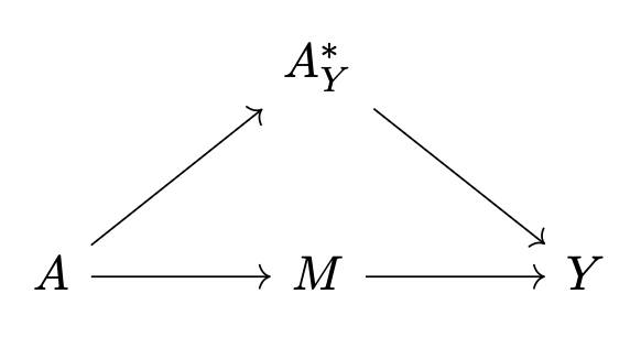 This shows that \[ \text{DE} = \frac{\sum_m \Big( \mathsf{E}[Y \mid A=1, M=m] - \mathsf{E}[Y \mid A=0, M=m] \Big) P(M=m \mid A=0)}{P(A^*=1 \mid A=1) - P(A^*=1 \mid A=0)}. \] So the absolute value of the directed effect of \(A_Y^{*}\) is also bounded below by the absolute value of the usual estimand for natural direct effect: